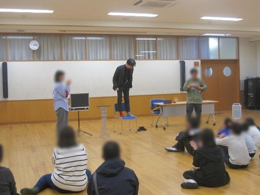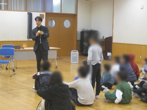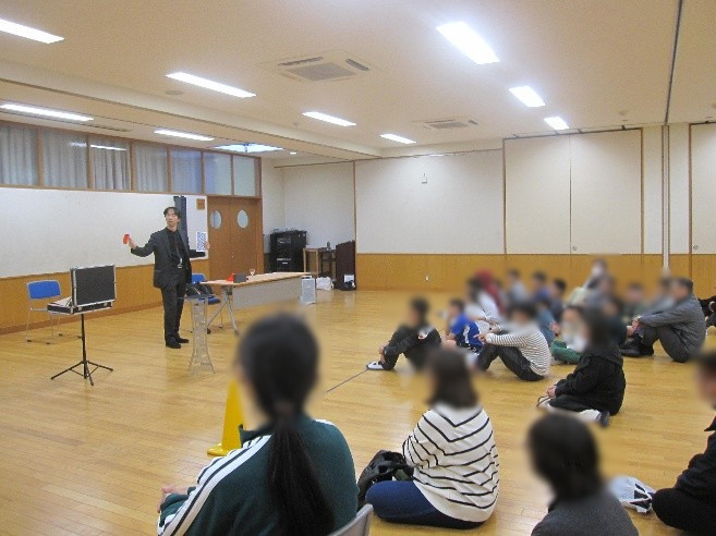 スマイル部 マジックショー観賞会 実施日 2025年10月30日 今年度は、「野島法律事務所」の野島先生に依頼をし、手品を披露していただきました。パンの中からトランプが出てきたり、テレビで見るような手品を目の前で見ることができ、子ども達はもちろん保護者も大興奮でした。